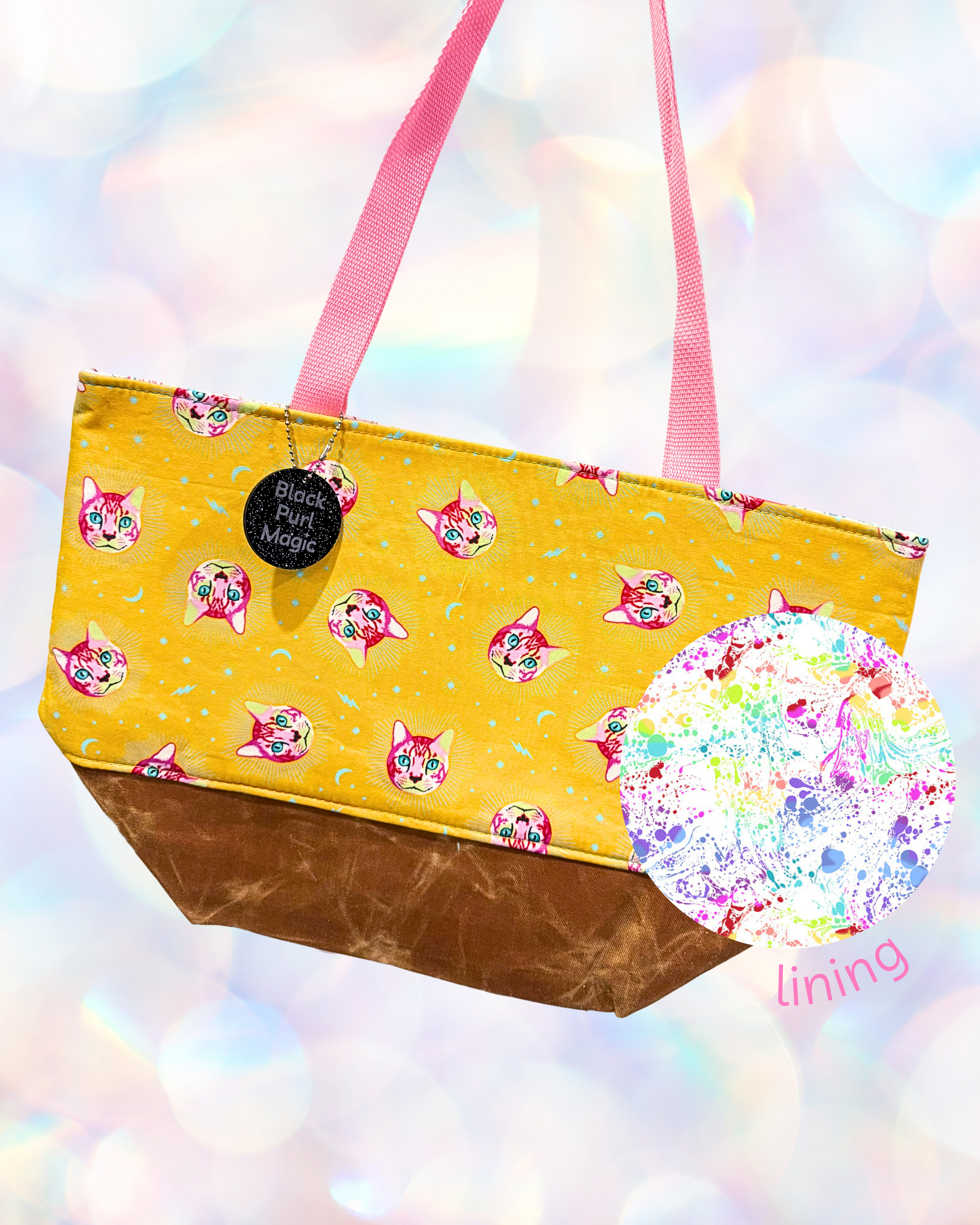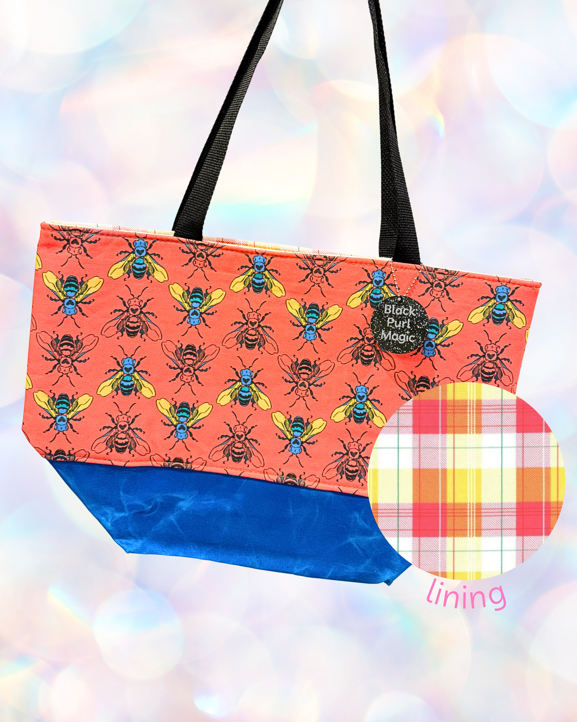 This tote features a protective cushiony lining, an inner split slip pocket, a heavy waxed canvas base and long abrasion resistant handles. It comes with a custom BPM bag charm that can triple as a stitch marker holder or a cute keychain!
